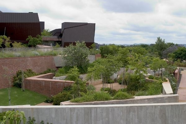 博物館的設(shè)計(jì)概念來(lái)自傳統(tǒng)治療師的“愈合”花園,這種花園在北開(kāi)普省庫(kù)魯曼的一個(gè)農(nóng)莊中可以見(jiàn)到。設(shè)計(jì)概念逐步演變,創(chuàng)造了大巨石一樣的體量,其中包含講故事空間。