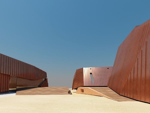 巨石設(shè)置在Salvokop山山腳,就像一塊露頭的巖石。建筑的墻體和屋頂都覆蓋了銅板,“露頭的巖石”將隨著時(shí)間的推移,逐漸銹蝕成綠色,與自然景觀(guān)融合在一起。