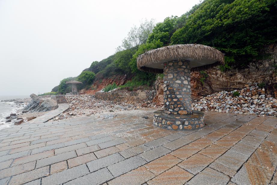 神路廣場北側(cè)休息平臺(tái),原為破損漁民生產(chǎn)用房。設(shè)計(jì)保留房子基礎(chǔ),改造成觀景平臺(tái),平臺(tái)上設(shè)計(jì)休憩構(gòu)架。